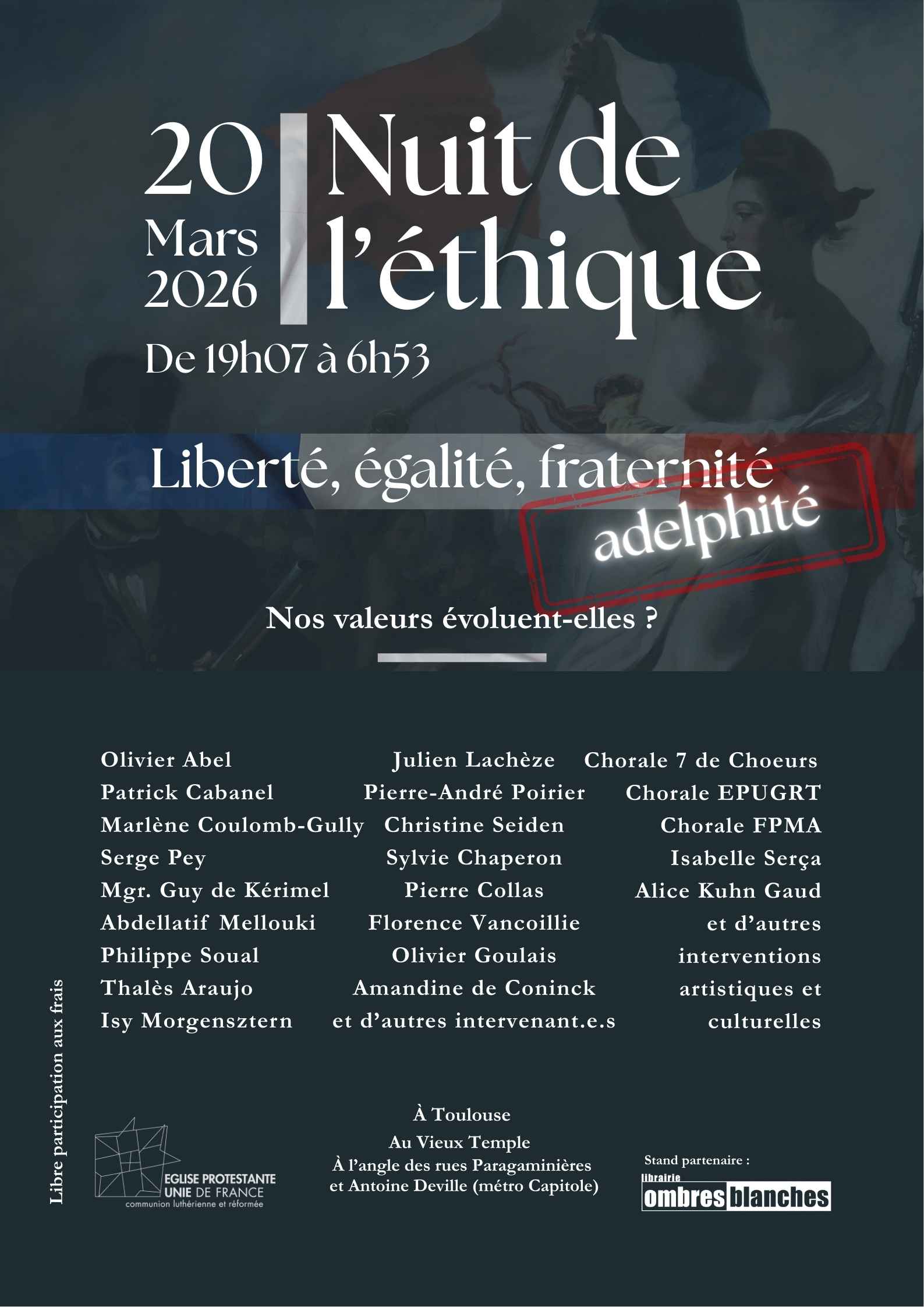 La nuit réunira notamment le philosophe Olivier Abel ainsi qu’une vingtaine d’intervenantes et d’intervenants issus de différents horizons professionnels, intellectuels et artistiques. Chercheurs, responsables religieux, artistes, acteurs du monde social et culturel feront dialoguer leurs disciplines et leurs expériences, dans un esprit d’ouverture et de pluralité des regards.